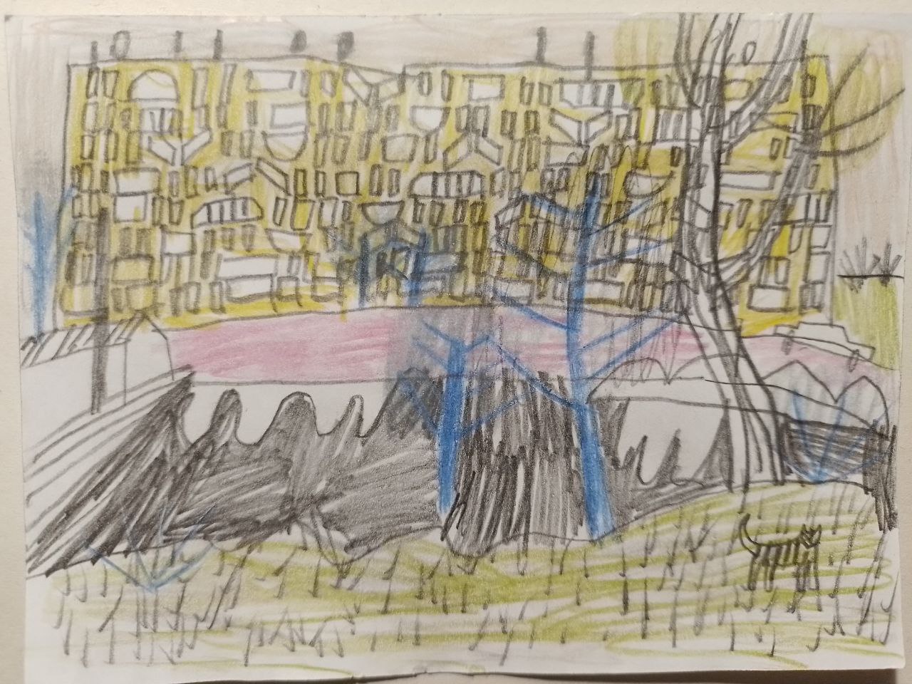 — У него нет одного цвета. Это палитра — белый, голубой, охра, светло-зеленый. Но вообще я редко использую цвет — мне с ним труднее, он требует большей сосредоточенности. Хотя была, например, серия маленьких рисунков про Ташкент — около 50 штук цветными карандашами. Там получилось.