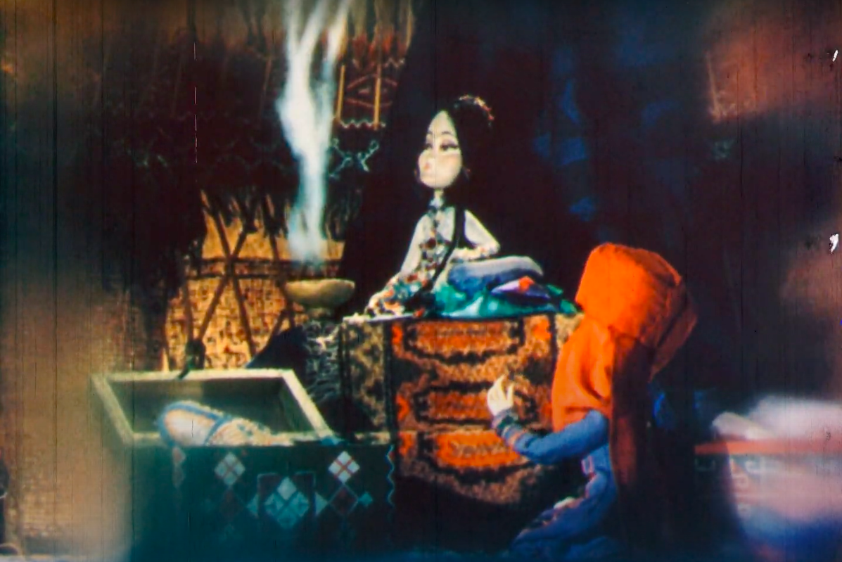 Проникновенное женское пение открывает мультфильм — будто плач по несбывшемуся. Перед нами — пустыня, юрты, верблюды, пронизывающий ветер и перекати-поле. В центре — женщина в индиго-платье и алом платке, с бледным, будто выцветшим лицом. Ее юрта украшена богато, все в ней есть, но главное отсутствует — детский смех.