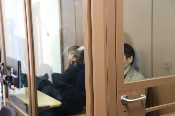 Во время процесса экс-министр (в клетке слева) старательно отворачивался от камер © Суд Астаны / TengriNews