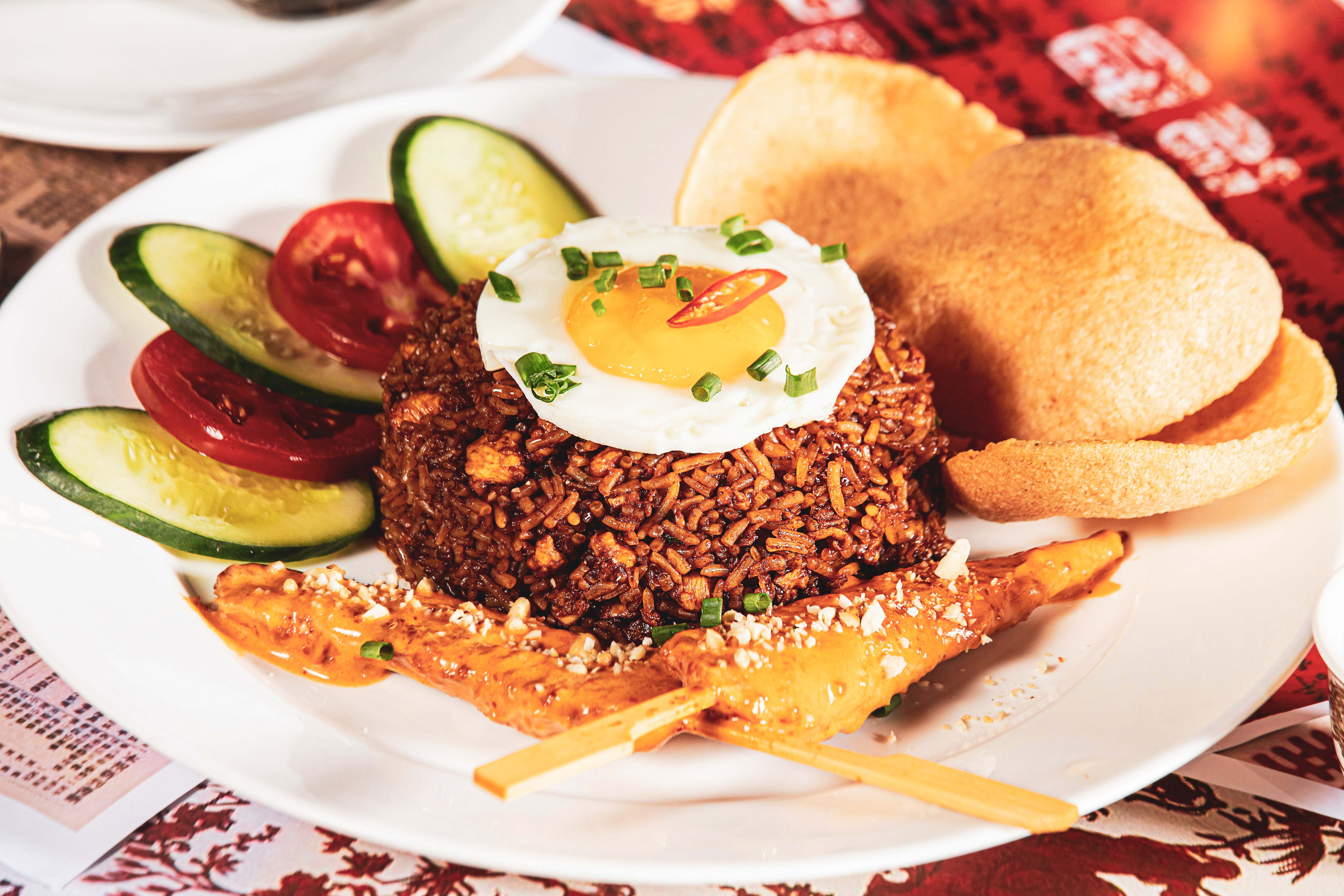 Наси-горенг в переводе с индонезийского означает жареный рис. Но рис сначала все же варят, а обжаривают потом с различными добавками: мясом, морепродуктами, овощами и специями. Часто подают с яичницей, креветочными чипсами и маринованными огурчиками — чтобы было и сочно, и хрустит. Соевый соус и паста из креветок добавляют характер — тёмный, насыщенный, уличный.