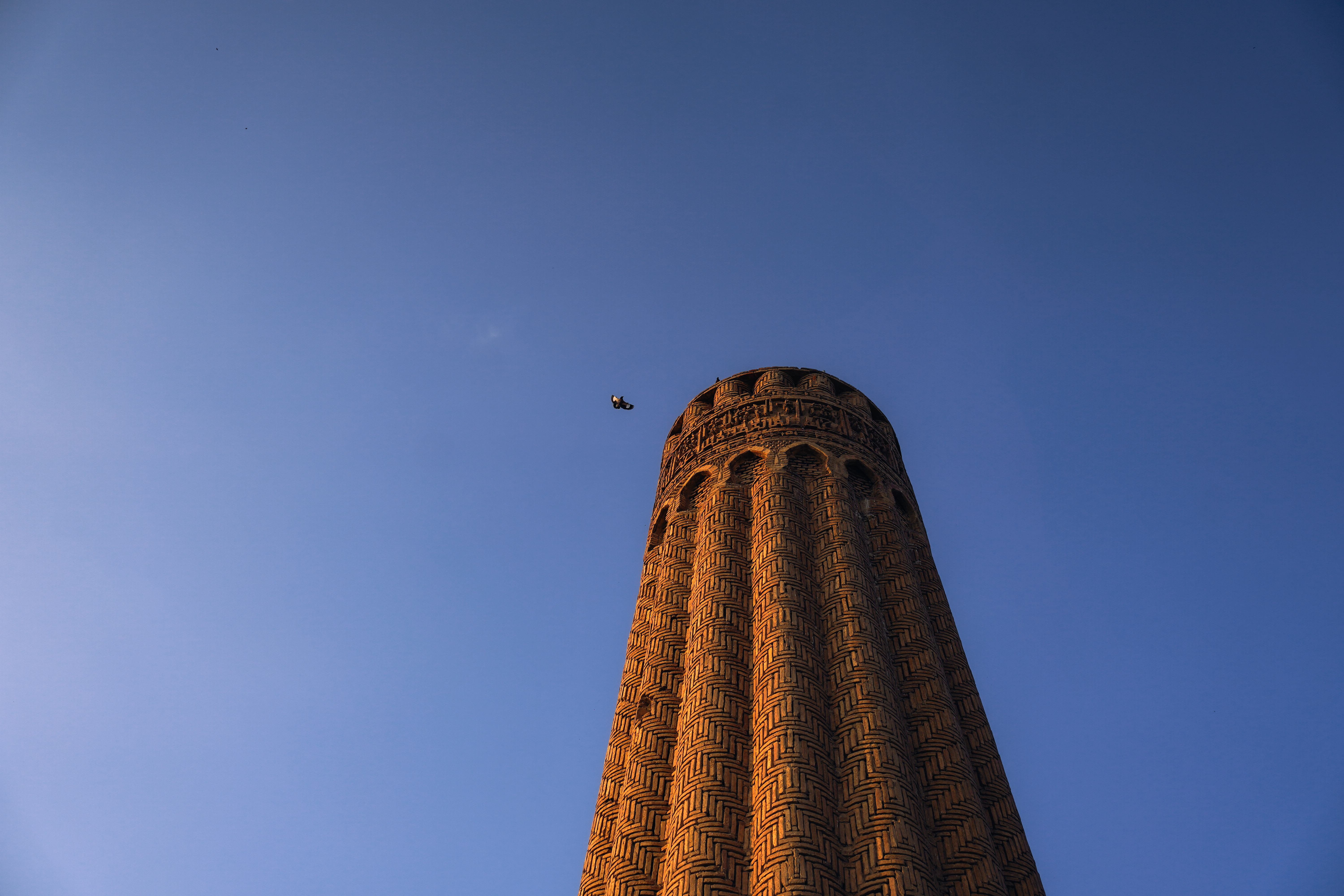 Эта башня не просто высокая — она тонкая, как игла, и кажется, будто пронзает небо. Построена из обожженного кирпича, украшена орнаментальными поясами и вставками из глазурованной плитки.