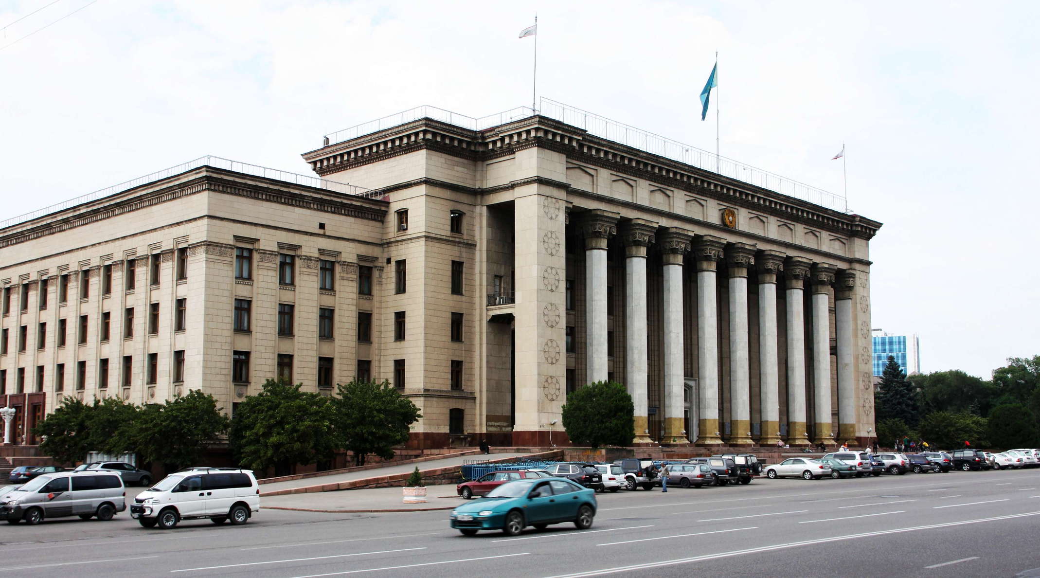 Самое важное место в архитектуре советских республиканских столиц тридцатых годов заняли правительственные здания и театры, выполнявшие также роль залов для партийных съездов и конференций. Конкурс на Дворец правительства в Алма-Ате прошел в 1937 г. Победили в нем высокопоставленные ленинградские архитекторы Борис Рубаненко и Георгий Симонов. Перед войной успели только выкопать котлован. Проект много раз перерабатывался и был построен только в 1957 г. Это типичное сталинское парадное неоклассическое здание с глубоким шестиколонным двухрядным портиком и обязательными для того времени элементами национального декора.