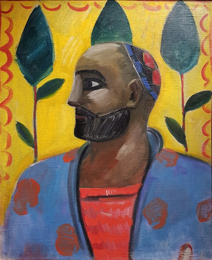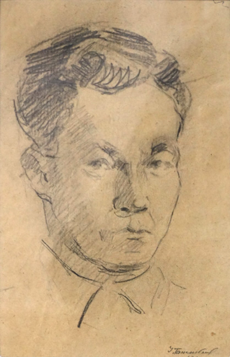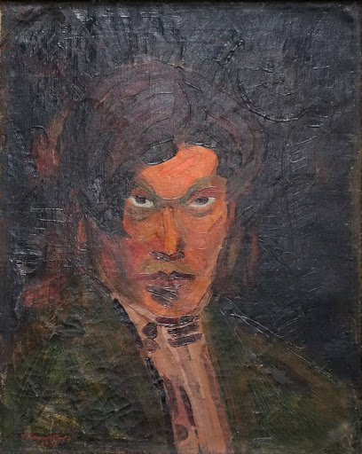 Ранняя работа, в которой доминируют сдержанная палитра, угловатые формы и тяжелый, почти скульптурный объем. Влияние экспрессионизма и посткубизма ощущается в напряженности линий. Образ как бы высечен из темной материи — в нем чувствуется драматизм становления личности на фоне эпохи.