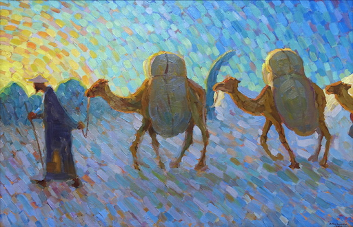 На картине верблюды неспешно движутся навстречу свету — как будто сама жизнь идет своим вечным путем. Художник написал свое произведение мазками чистых, переливающихся цветов, словно соткал полотно из света и воздуха. Это не просто сцена из восточного быта — это образ дороги, традиции, внутреннего покоя.