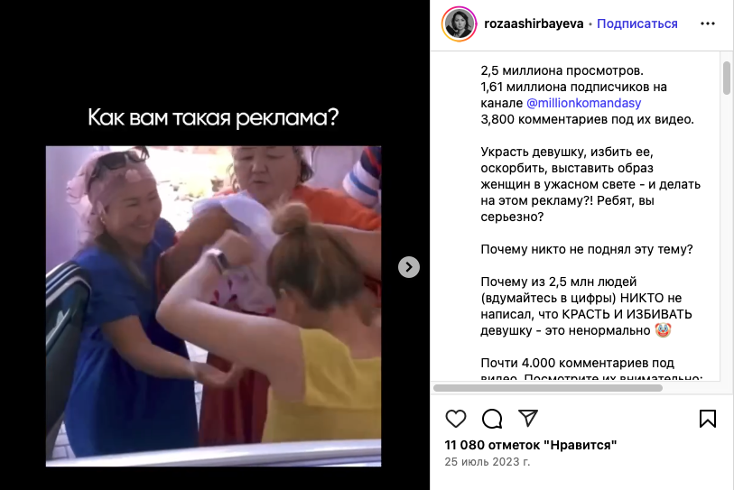 Похожий инцидент произошел и в Казахстане, где «похищение невесты» квалифицируется как похищение человека и наказывается тюремным сроком от 4 до 7 лет. В том же 2023 году строительная компания Ram опубликовала рекламу, в которой мужчина привозит похищенную девушку в дом родственников. Та пытается сопротивляться, получает пощечину и падает на лестницу. Сцена заканчивается «комичным» поворотом: девушка восхищается качеством сборки ступеней и перил — именно такой продукт производит Ram — и решает остаться. Видео собрало 2,5 миллиона просмотров и почти четыре тысячи комментариев, вызвав бурную дискуссию о допустимости маркетинга, пропагандирующего насилие.