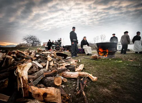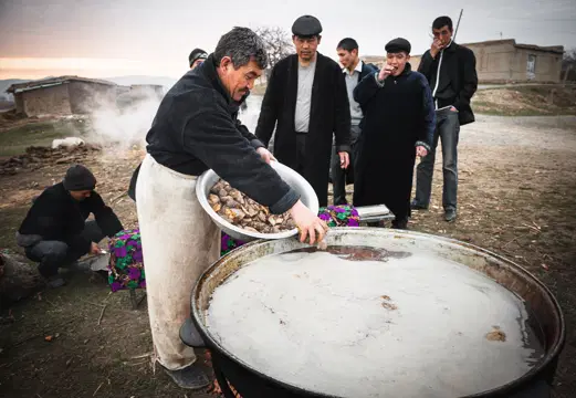 Медитативностью процесса, коллективной ответственностью это напоминает приготовление сумаляка, только здесь первенство отдано мужчинам. Содержимое 200-литрового казана мешают четверо.