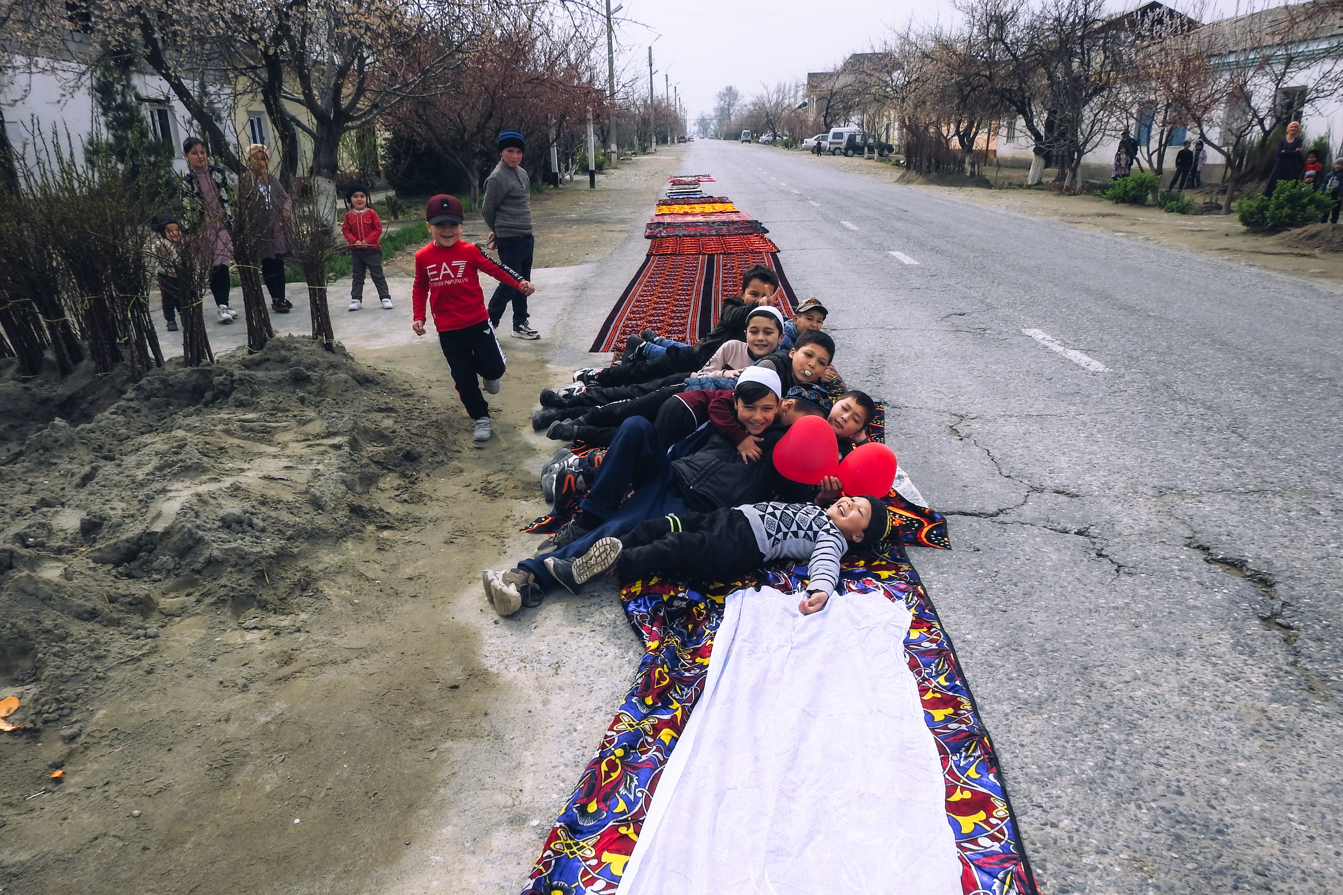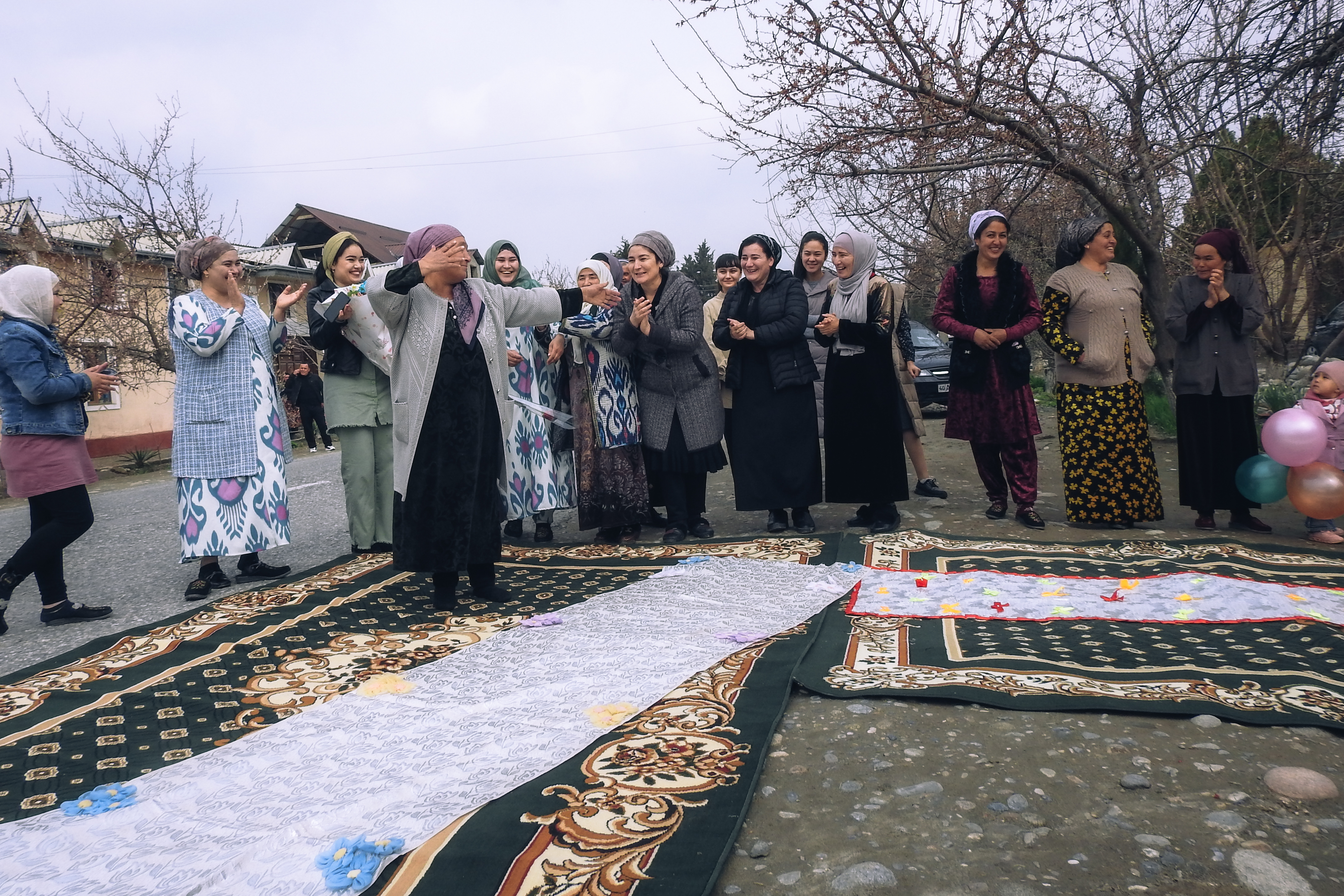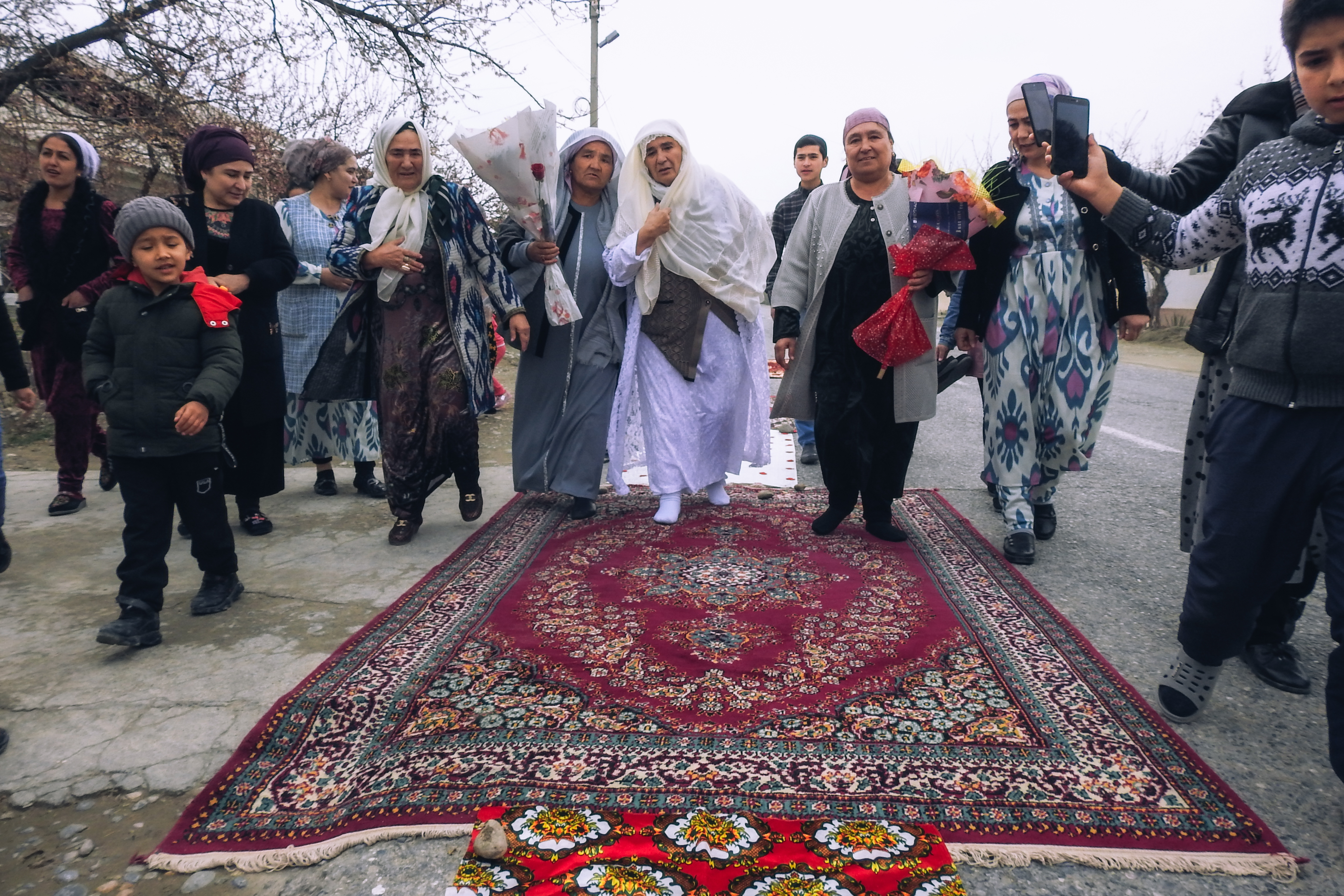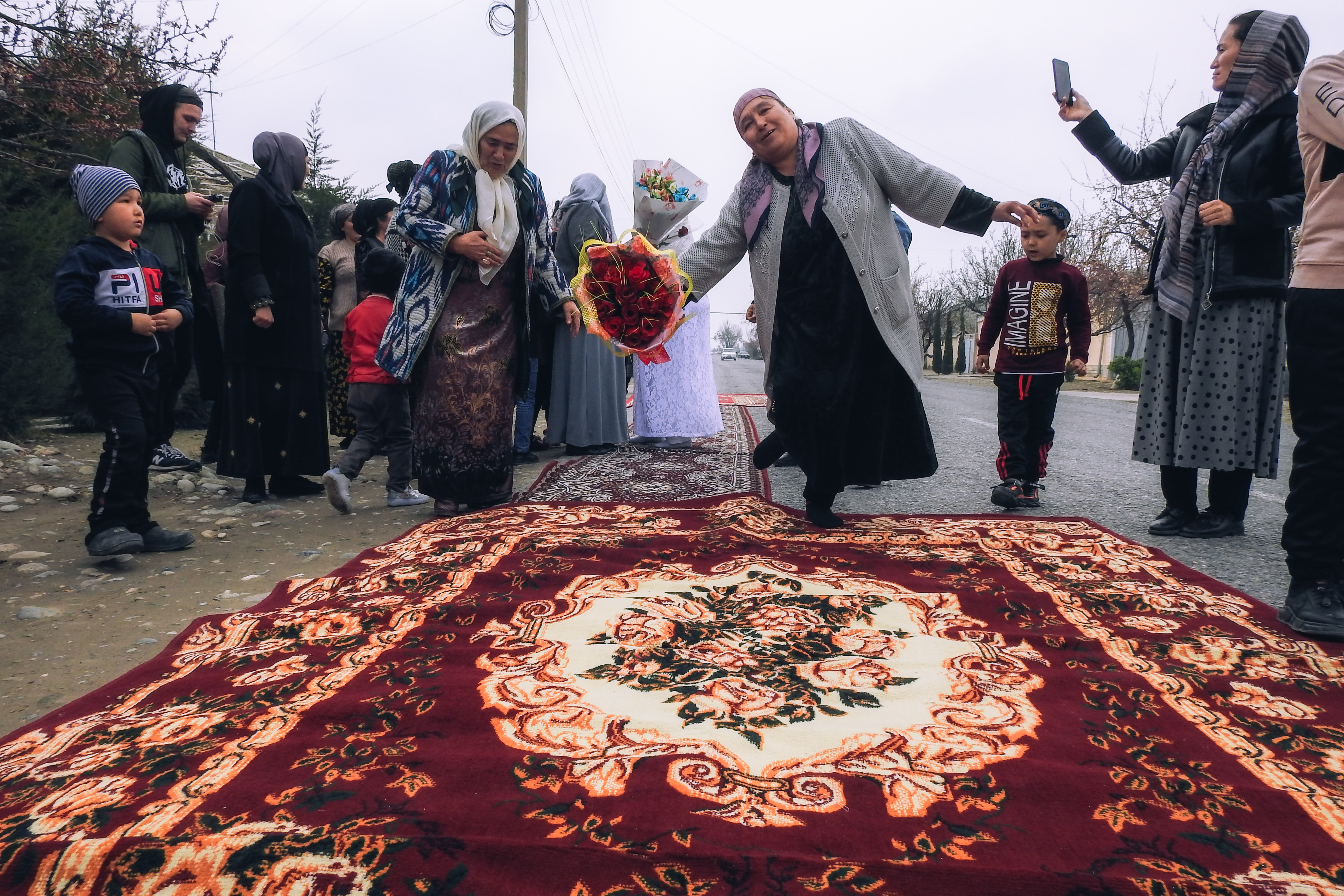 На протяжении всей «дороги почёта» по обеим сторонам выстраиваются соседи и детвора. Шарофат-опа и её родные угощают односельчан святой водой Замзам, те вручают букеты.