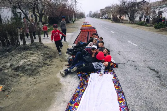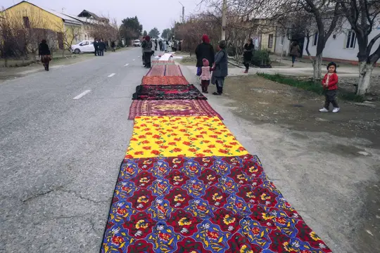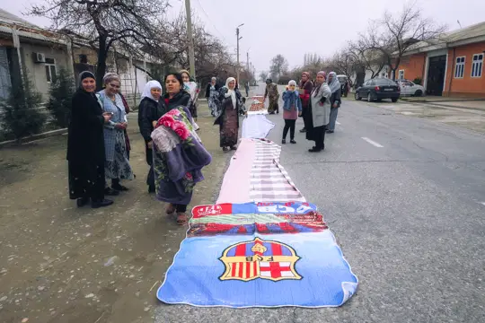 Сын Шарофат-опы заранее в этот важный день отправился в Фергану и ждал её в аэропорту. Одновременно с этим для неё готовится путь домой длиной в 1,5 км. Выглядит это необыкновенно красочно. Кто что может: соседи вытаскивают на улицу свои курпачи и одеяла. Сложив все это в дорожку, накрывают чистыми простынями.