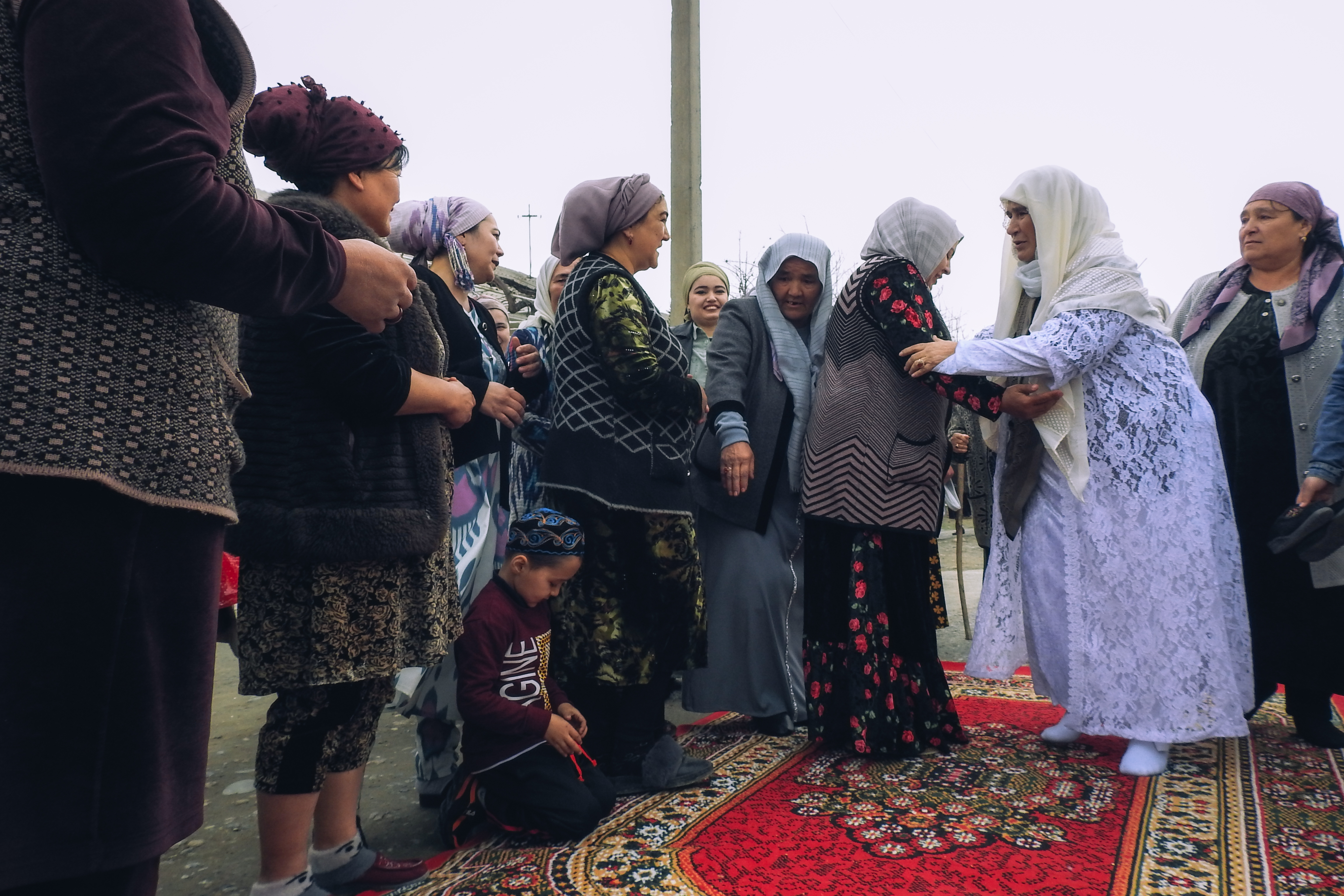 После этого все члены семьи заходят в дом. С этого момента соседи довольно споро начинают разбирать свои курпачи и одеяла, чтобы следом пойти и почтить героиню дня в её доме.