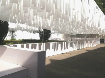 “Korrupsiyaga qarshi kurashish agentligi binosi – mening O‘zbekistondagi birinchi mualliflik loyiham. Uning peshtoqida g‘isht teksturali qoplama asosiy o‘rin egallaydi. Dastlab fibrotsement fasad panellari rejalashtirilgan edi, ammo bojxona tartib-qoidalari tufayli loyiha byudjeti smetaga sig‘madi. Bu asosiy muammolardan biriga aylandi. Men hatto yangi dizayn variantini ko‘rib chiqdim. Biroq, oxir-oqibat biz muqobil yechim topdik – yetti qavatli binoning butun tashqi devorini qo‘lda g‘isht terish uslubida chizib chiqdik. G‘alati tuyuldi, lekin biz bu rejamizni amalga oshirishga muvaffaq bo‘ldik. Zamonaviy san’at markazining ichki hovlisidagi installyatsiya soyabon sifatida yaratilgan. Yozda u yer juda issiq bo‘ladi: daraxtlar umuman yo‘q, quyosh esa shafqatsizlarcha kuydiradi. Ayni paytda, markaz maydonchadan turli tadbirlar – kafe, kino namoyishlari va boshqa turdagi faoliyatlar uchun foydalanishni istagandi. Vazifamiz cheklangan byudjet bilan yozgi mavsum uchun ko‘p funksiyali tuzilmani yaratish edi. Yechim muvaffaqiyatli bo‘ldi: yengil matolar yorug‘lik va soya o‘yinini yaratib, qulay salqinlikni ta’minladi, shu bilan birga qurilish xarajatlari minimal darajada bo‘ldi”.