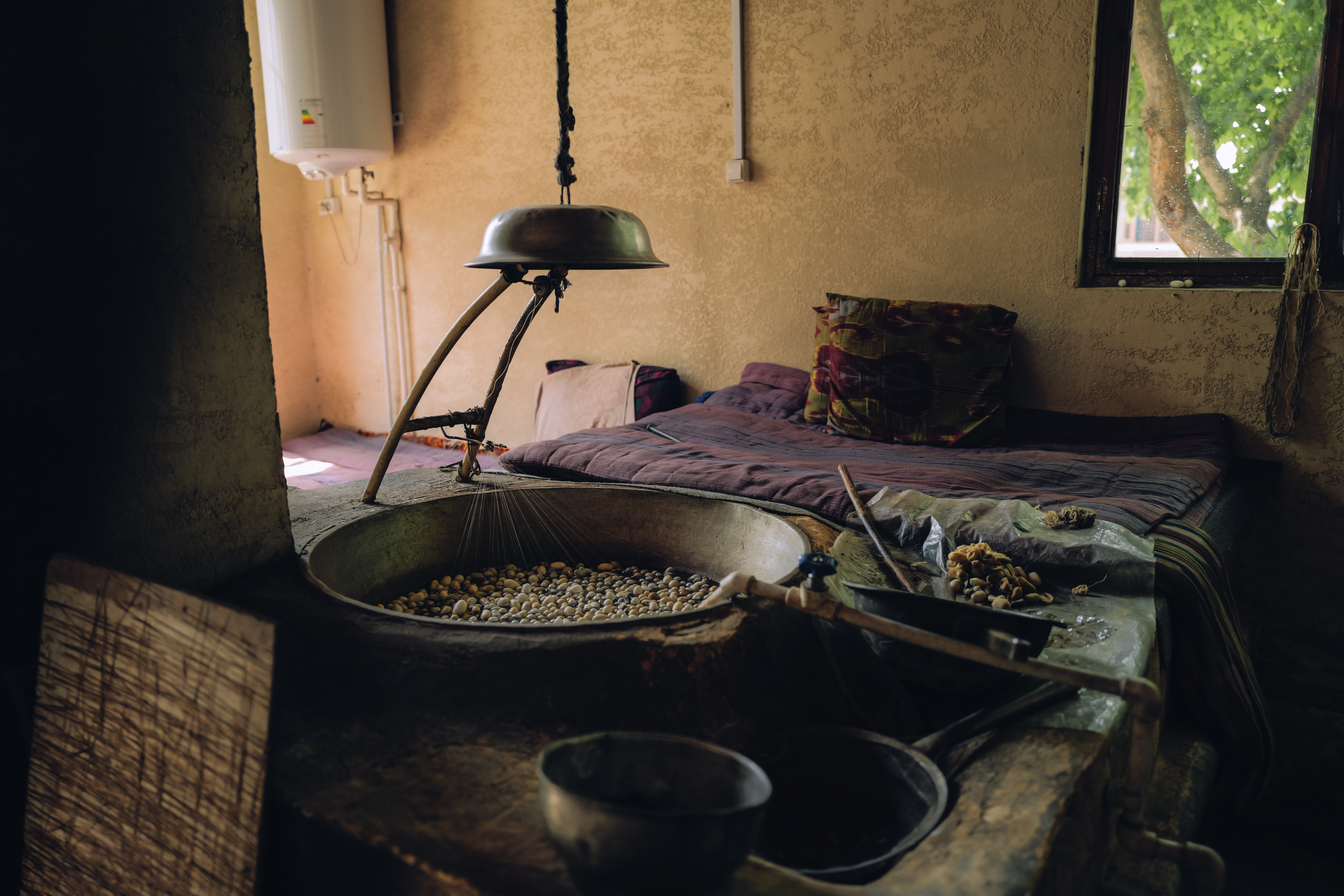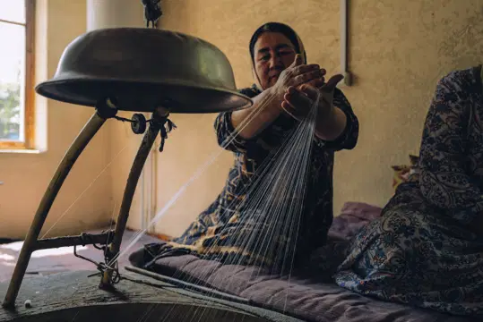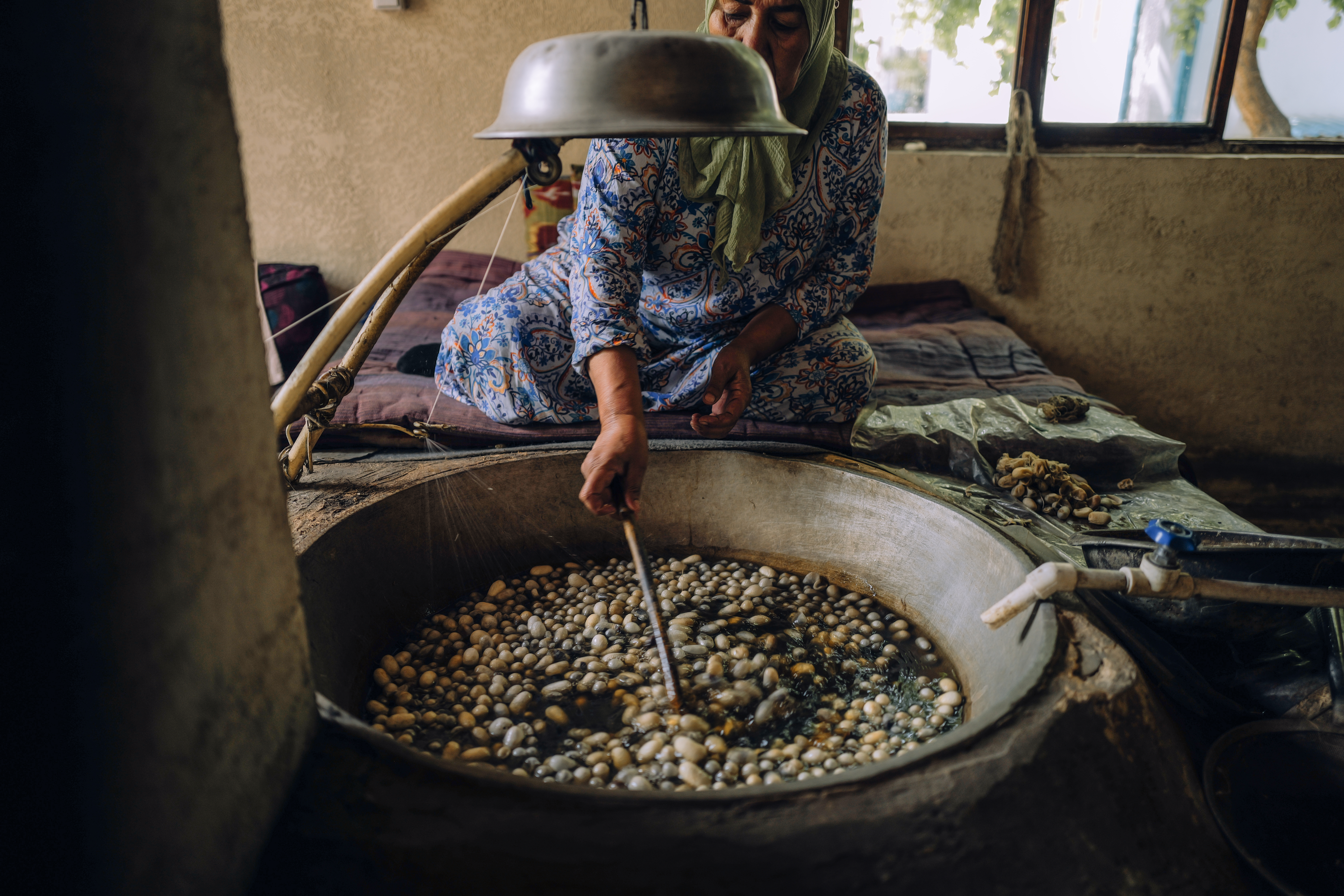 Ipak qurtining pillasi katta qozonlarda suvda qaynatiladi va keyin ip tortiladi — bitta pilladan 2 kilometrgacha uzunlikdagi ip olinadi. Keyin oqartirish va yumshatish jarayoni boshlanadi.